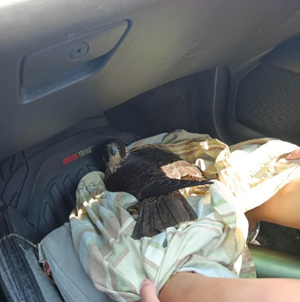 After a very careful intake, Young determined the peregrine falcon was still a bit of a baby, who’d likely hatched earlier this year. He probably got lost looking for food.