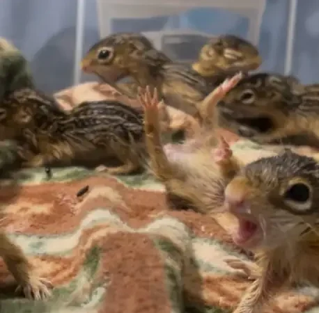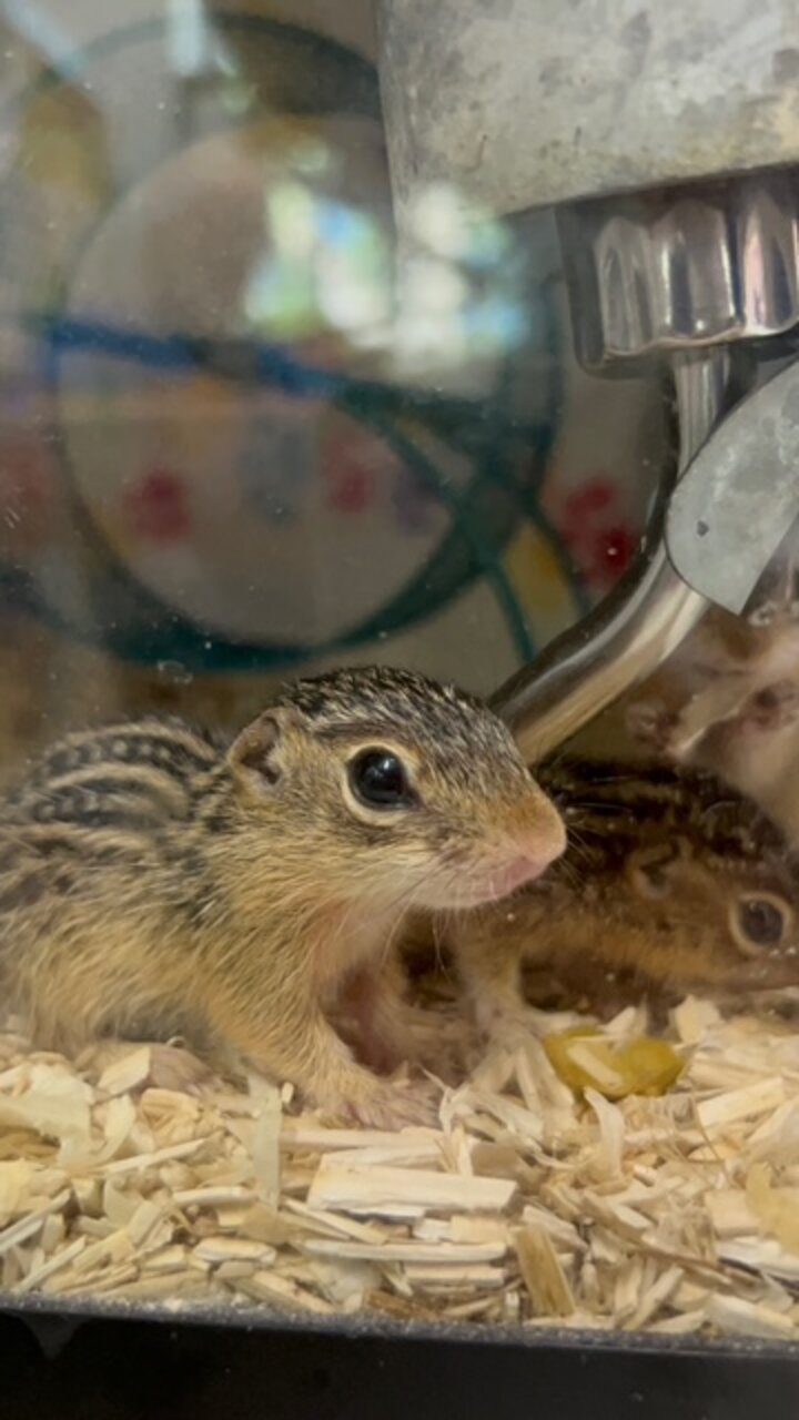 Nine baby thirteen-lined ground squirrels arrived at Oaken Acres Wildlife Center after being rescued from a woman’s backyard. They were lingering around an underground den where their mother had sadly passed away. The babies were too young to survive on their own, and by the time they were rescued, they were weak and dehydrated.
